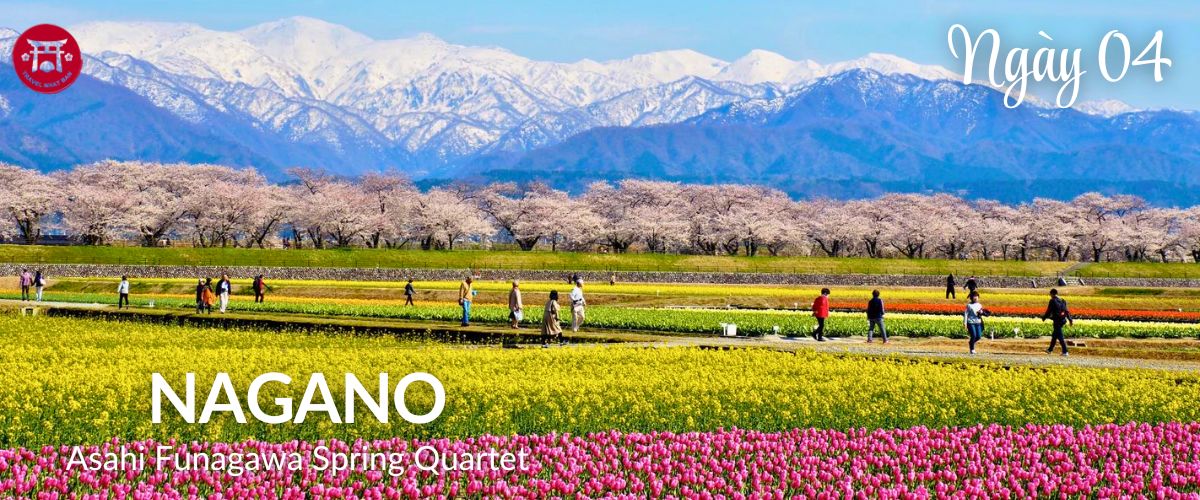 Mùa xuân đã đến dọc theo sông Asahi Funakawa, Hoa anh đào đang nở rộ và bạn có thể thưởng thức “Bộ tứ mùa xuân” trên nền núi và tuyết. Niềm vui ngắm hoa anh đào được nhân đôi với hoa cải và hoa tulip